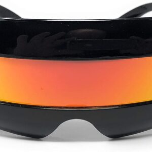 Fun Futuristic Single Revo Lens sunglasses. The revo lens creates dynamic color changes based upon light hitting the lens. A very cool look! They are sure to draw the attention of any crowd. Available in a variety of lens colors that are perfect for anyone making a statement at the party! Made with an acetate based frame, metal hinges and poly carbonate UV protected shield lens. They are rated at 100% protection of UV rays. Fun for an Alien Costume or “space girl”. Definitely a statement. These are a inexpensive light weight novelty pair of glasses. Very basic in design and quality.